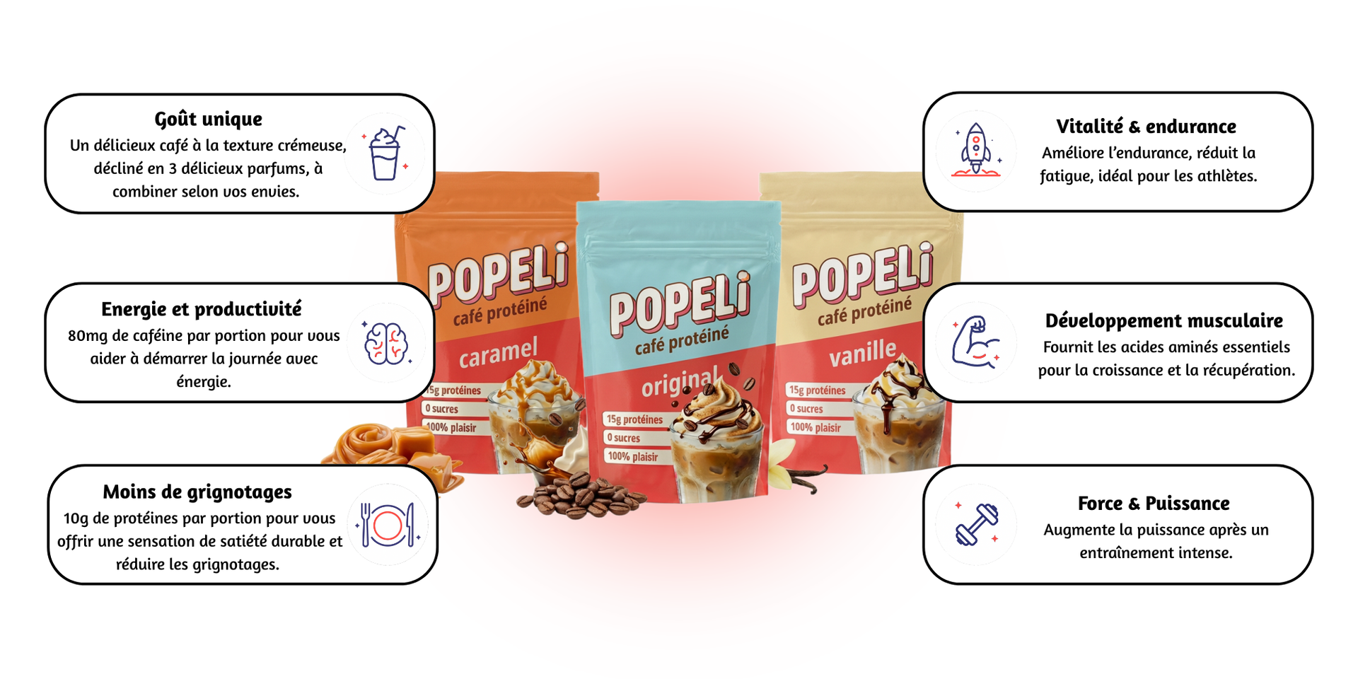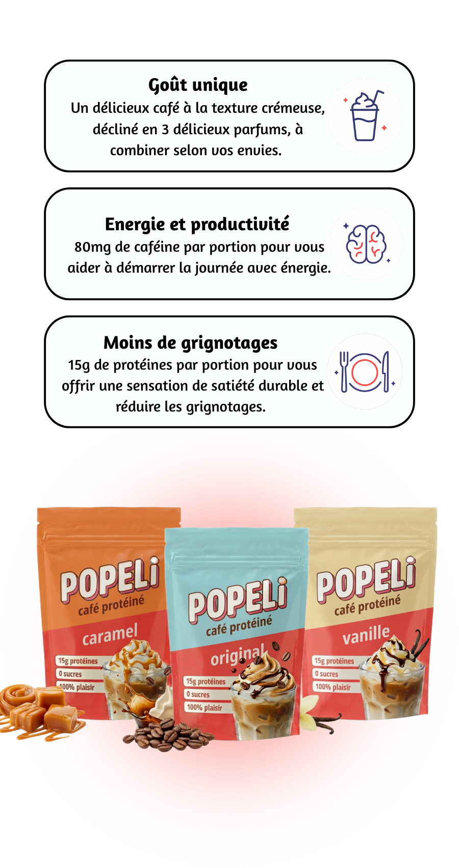 Nos produits sont conçus pour les amateurs de café qui veulent des boissons faciles à préparer, délicieuses et sans culpabilité, afin de vous faire gagner du temps pour ce qui compte vraiment. Avec Popeli, profitez d’un café à votre façon, soutenu par notre Garantie 100 % Bonheur.